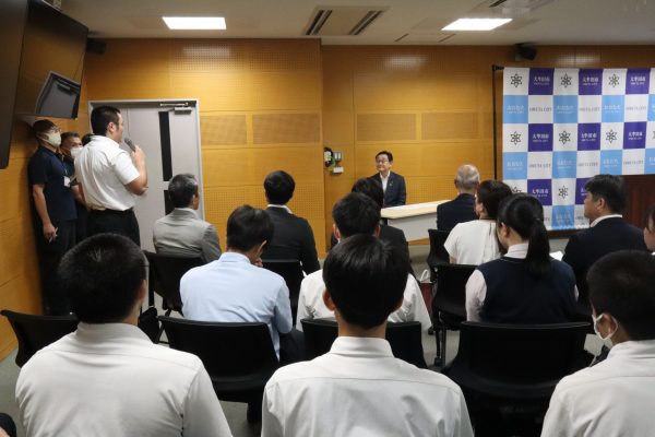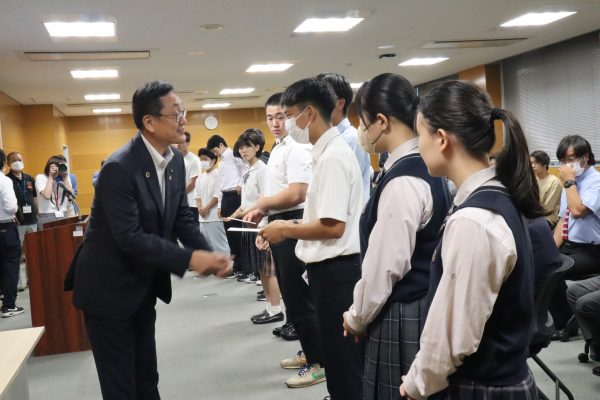 7月14日(金) 関 好孝市長を訪問し、夏に開催される全国総合体育大会、総合文化祭への出場を報告しました。全国総合体育大会には柔道部・駅伝部・ソフトテニス部が、全国総合文化祭へは吹奏楽部・美術部が出場します。柔道部の三木望夢(主将)は3年生の集大成となるように一戦一戦を大切にして戦いたい。そして、男子団体戦、男子個人戦(100㎏級)ともに優勝を目指したいと話していました。