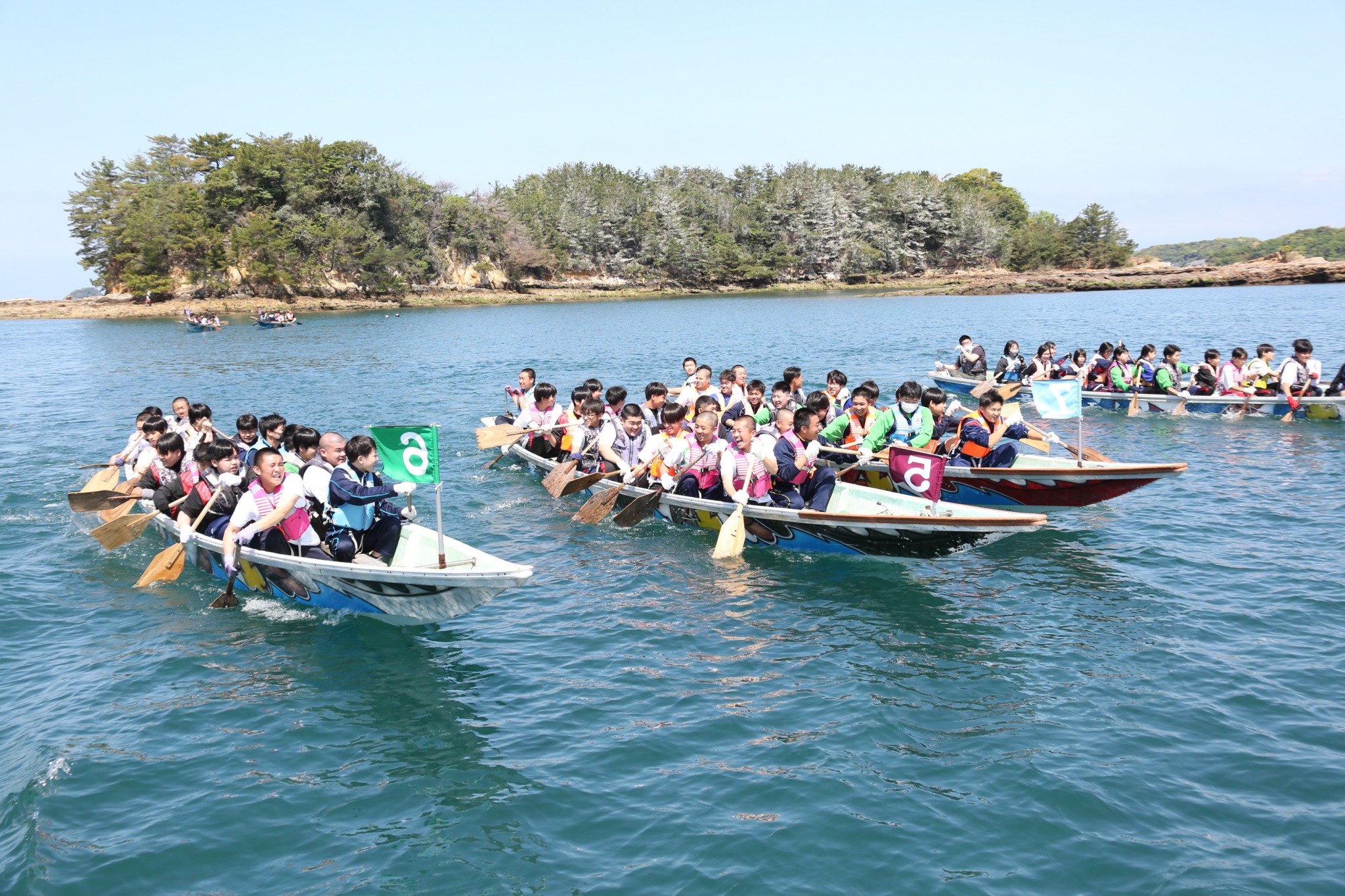 研修2日目は、今回の研修の目玉であるマリン活動を行いました。朝から天気は良かったのですが、風が強く、波が高くなると実施できないので、心配していましたが、実施の時間委には風も穏やかになり、無事実施できました。ペーロン船と言う船に16人ずつ乗り込んで、息を合わせて櫂(かい・オール)を漕ぎ、仏島まで約500mの距離を往復しました。