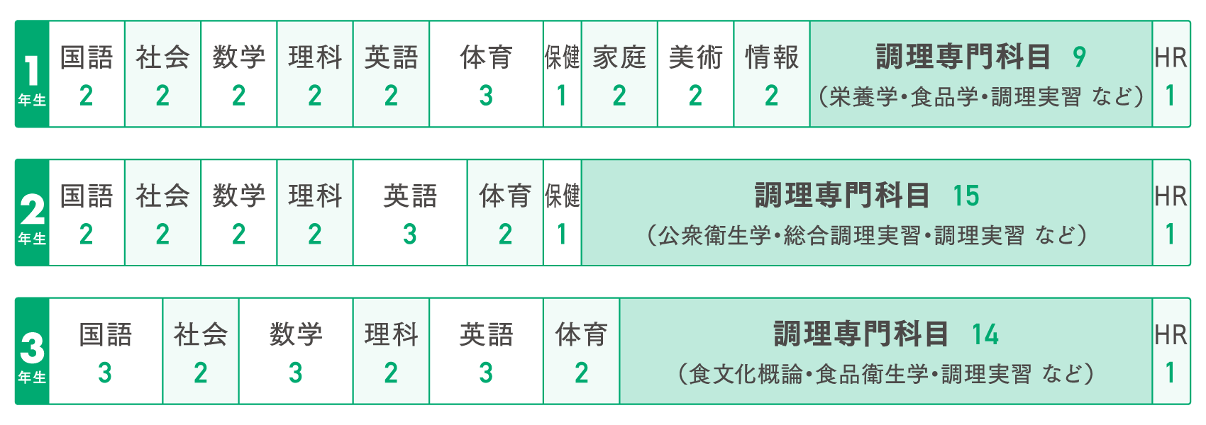 1年生は日本料理、2年生は西洋料理、3年生は中国料理を学びます。