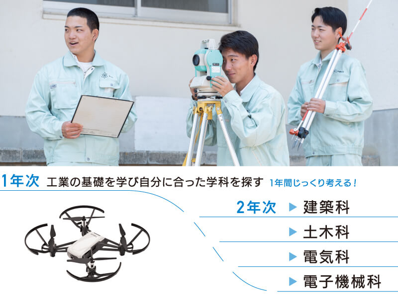 建築科・土木科・電気科・電子機械科の4つの科に分かれ、それぞれの専門教科を学習します。自分の選んだ科でマイスターを目指そう!