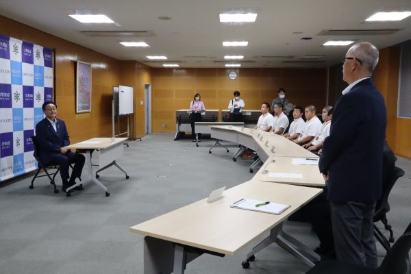 9月19日(火) 関 好孝市長を訪問、夏に開催された全国総合体育大会と金鷲旗の入賞報告を行いました。大会の結果は下記に記載しています。市長表敬訪問で駅伝部の谷本昂士郎はこれから駅伝のシーズンに入るので全国高校駅伝大会出場を目標に頑張りたいと抱負を述べていました。柔道部の三木望夢は大会は終わってしまったが、次のステップでも柔道選手として活躍したいと話していました。