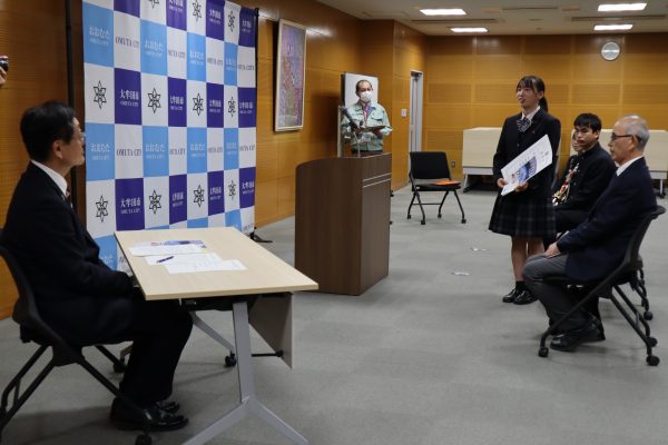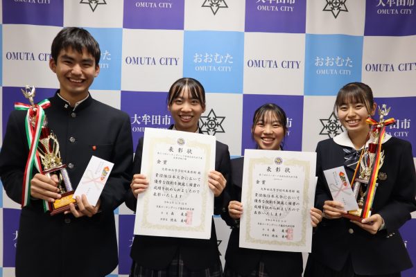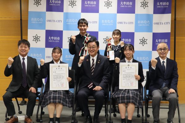 11月29日(水) 関 好孝市長を訪問し、第51回マーチングバンド全国大会及び第7回カラーガード・マーチングパーカッション全国大会への出場を報告しました。吹奏楽部部長の松永さんはマーチングバンド全国大会に向けて支えてくれた吹奏楽部の仲間や保護者などに感謝の気持ちを忘れず、全国大会では吹奏楽部みんなで最高の演奏をしたいと抱負を述べていました。また、来年1月に開催されるカラーガード・マーチングパーカッション全国大会に向けてガードチーフの池田さんはこのチームでパフォーマンスをする最後の大会になります。観客の方に感動を届けられるようなパフォーマンスを全国大会では披露したいと話していました。