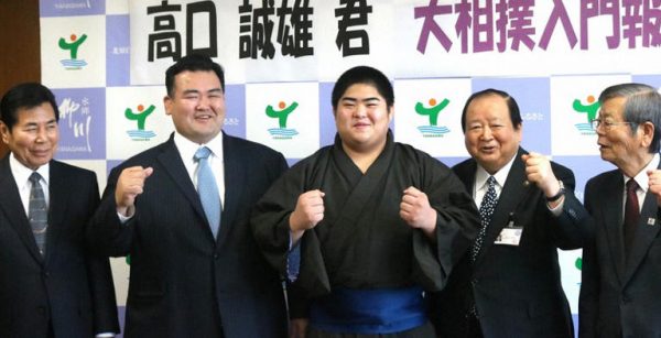 2月6日(月) 柳川市出身の佐渡ケ嶽部屋、秀ノ山親方(元大関琴奨菊)と同市出身で大牟田高校柔道部の髙口誠雄(土木科3年)が柳川市役所を表敬訪問し同部屋入門を報告しました。「妥協せず稽古に励み、柳川に恩返ししたい。てっぺん(横綱)を目指す」と意気込みました。