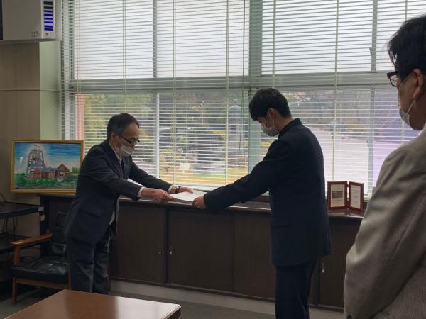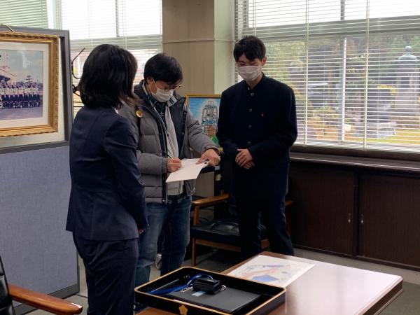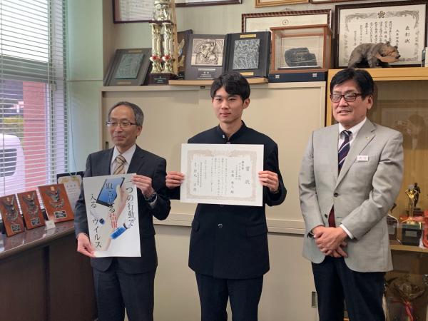 第16回IPA「ひろげよう情報モラル・セキュリティコンクール」2020ポスター部門で本校の総合学科3年マルチメディア系列の平原秀人くんが優秀賞に輝きました。12月24日(木)に福岡県警察本部サイバー犯罪対策課・(公社)福岡県防犯協会連合会様より表彰をしていただきました。