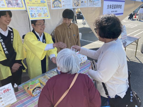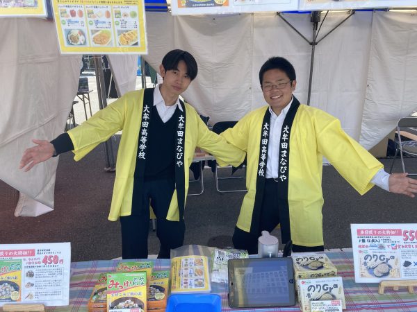 大牟田まなびやでは調理科と同じテントでオリジナル商品を販売し地域の皆様と触れ合うことができました。ありがとうございました。また、後日、今回の売上金を含め、昨年のお歳暮からのオリジナル商品頒布金合計額を日本赤十字社を通じて能登半島地震災害義援金として募金する予定です。