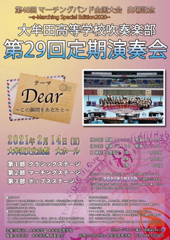 令和3年2月14(日)に大牟田文化会館で開催予定の「大牟田高等学校吹奏楽部 第29回定期演奏会」につきまして、緊急事態宣言の延長と新型コロナウイルス感染拡大防止を鑑み、有観客での開催を見合わせました。