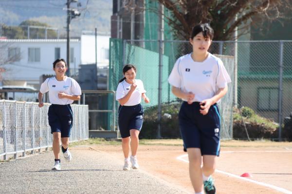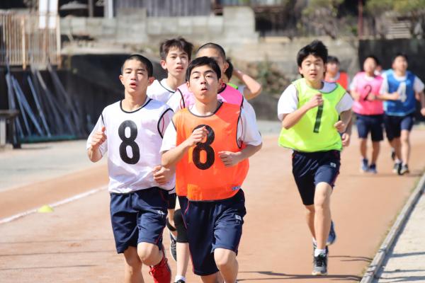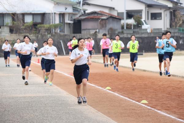 中学校マラソン大会が2月中旬に行われました。例年、緑地公園において、中学生全員で男女毎の一斉スタートで行われていましたが、今年度は新型コロナウイルス感染対策のため、校内のグランドにおいて、各学年で、男子と女子に分かれて行われました。