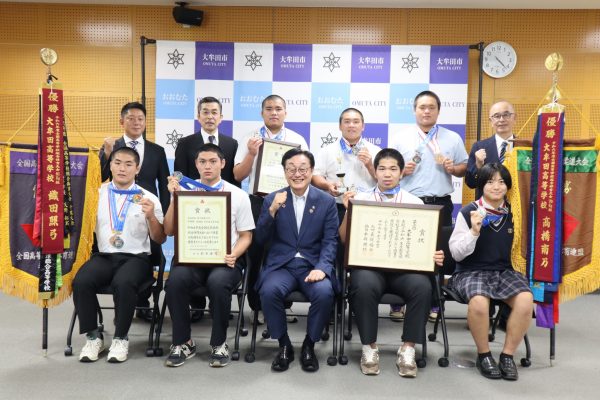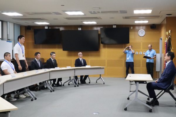 9月24日(火) 関 好孝市長を訪問、夏に開催された令和6年度全国総合体育大会の入賞報告を行いました。また、7月22日~24日に福岡市総合体育館で開催された金鷲旗と9月7日~8日に高崎アリーナ(群馬県)で開催された全日本ジュニア柔道体重別選手権大会についても関市長へ入賞の報告を行いました。