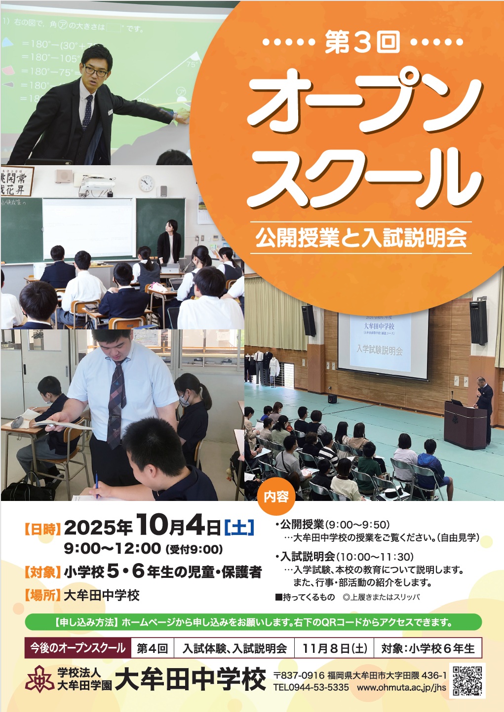 第3回オープンスクールは公開授業と入試説明会です。日頃の大牟田中学校の授業をご覧ください。入試説明会では、入学試験の詳細と本校の教育について詳しく説明いたします。