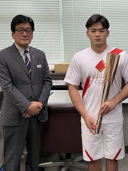 本校柔道部卒業生の森健心(明治大2年)が、大牟田市にゆかりのあるランナーとして聖火リレーに参加しました。緊急事態宣言の発令に伴い、聖火リレーは中止となり、平和台陸上競技場での聖火点火式に参加しました。「貴重な体験ができました。次は自分が実際にオリンピックに出場して金メダルを獲るのが目標です」と来校してくれた時の様子です。