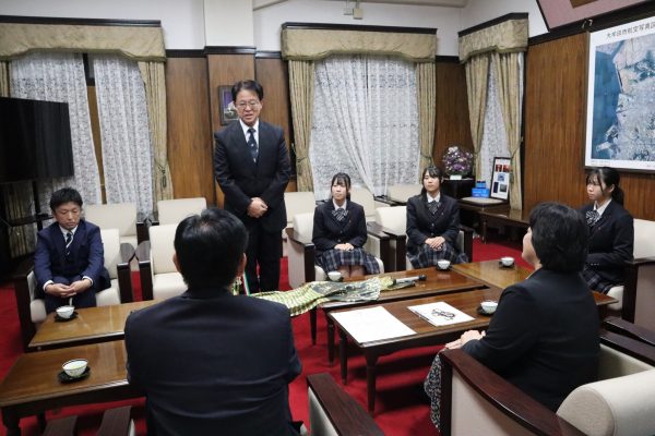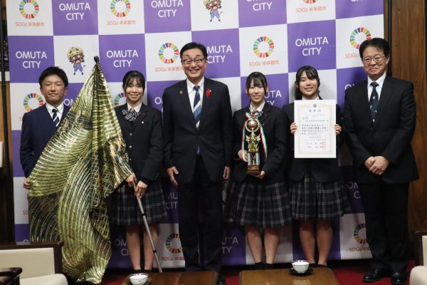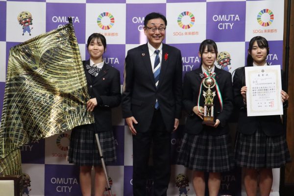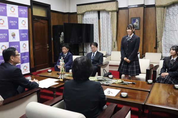 12月1日(月)関 好孝大牟田市長、 中村 珠美大牟田市副市長を訪問し、第53回マーチングバンド全国大会への出場を報告しました。吹奏楽部部長の松尾皆美さんが、今年こそは金賞受賞を目標に部員一丸となって全国大会に挑みたいと抱負を述べ、全国大会では最高のパフォーマンスを披露したいと話していました。大会の日程は下記に記載しています。