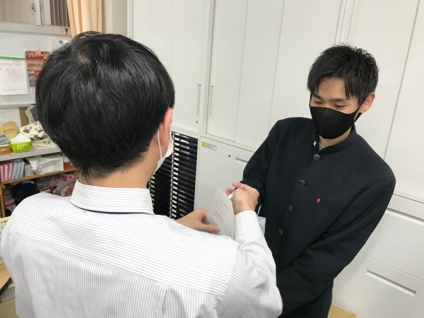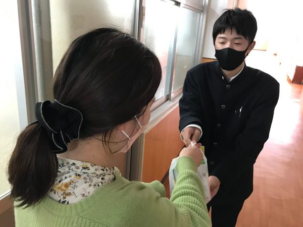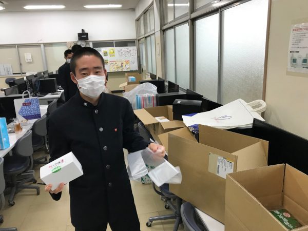 ですが、よりによって人手が必要なこの日に、2年次に実施できなかった修学旅行の代替として1日日帰りの修学旅行が当たってしまいました。残留生徒9名と教員1名で協力して82名の学校関係者へ配達することに…校内を歩き回って足が棒になりました….ですが、「感謝」です。企画立案から商品のお届まで楽しませて頂きました。購入いただき有り難うございました。
