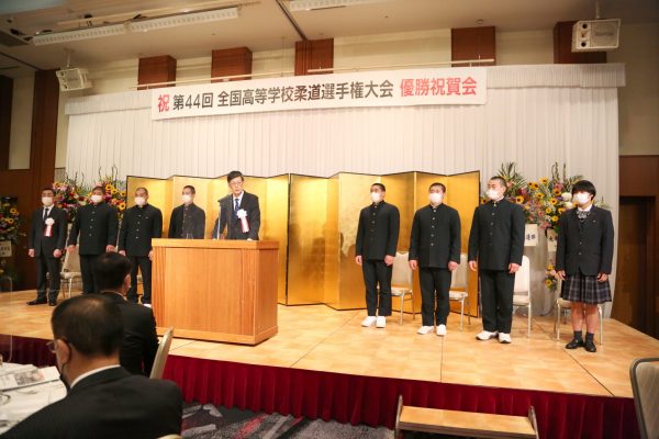 今春、日本武道館で開催された第44回全国高等学校柔道選手権大会において団体戦を制し日本一に輝いた柔道部をたたえ、4月30日に優勝祝賀会が催されました。