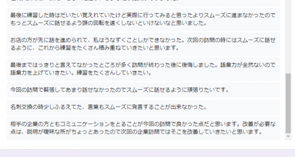 生徒達も緊張のあまり、手を声を震わせながら名刺交換をしていました。このような機会を重ねて、自信をもって話せるようになってほしいですね。期待しています。感想の一部を掲載します。